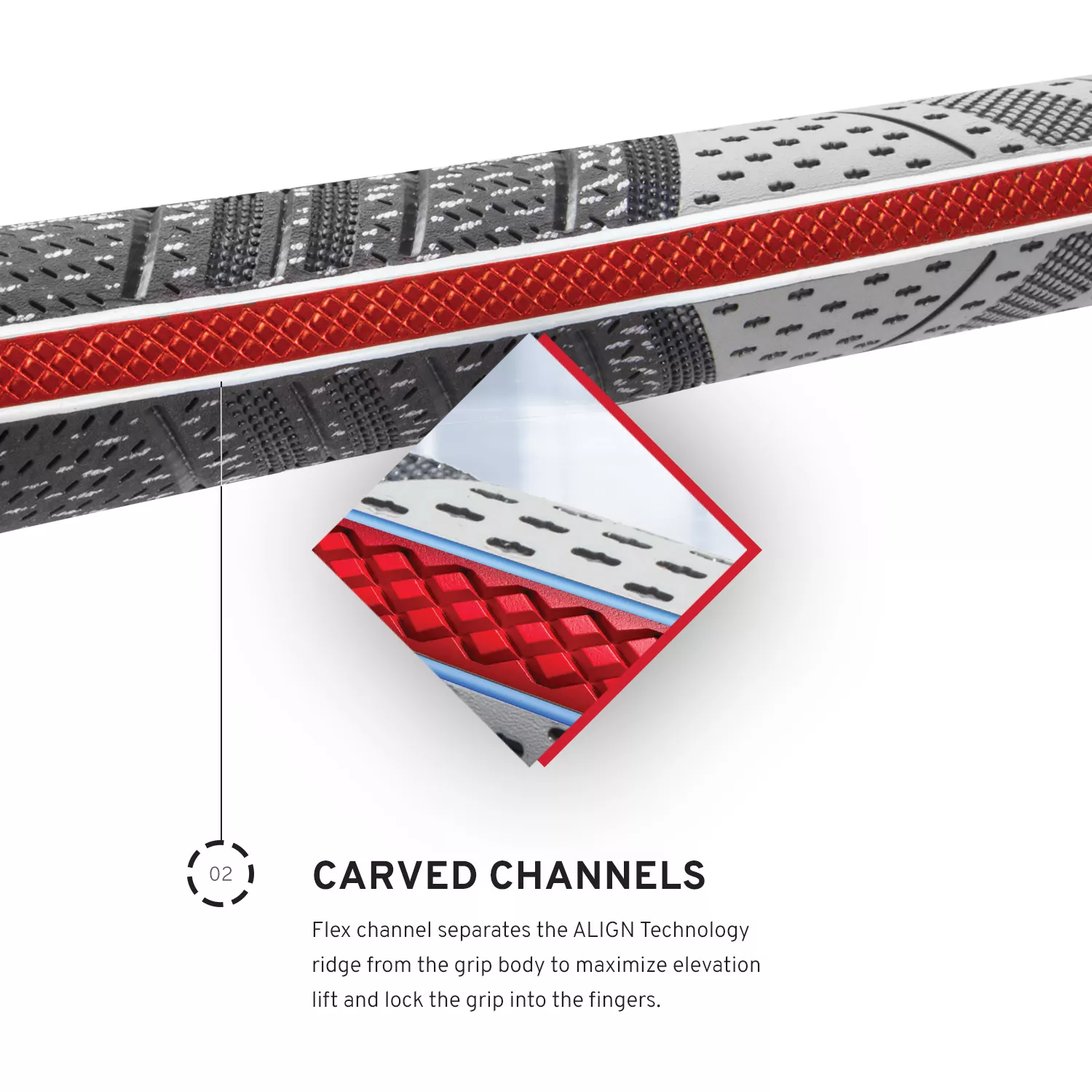 - Red ridge rises and extends down the back of the grip to lock the hands in place and aid alignment
